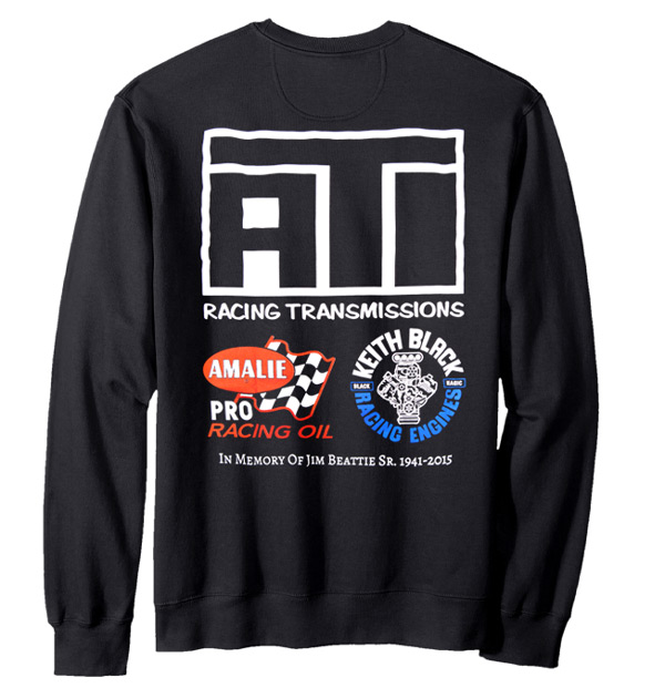This black crew-neck sweatshirt is a 55% cotton/45% polyester blend with vivid full color graphics featuring ATI's Black Magic racecar on the front and a retro ATI logo on the back.