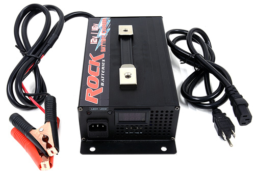Customers use a variety of methods to connect The Rock Chargers to their batteries, including alligator cable clips, bayonet connectors, top post, ring connectors, etc. Due to the variety of applications, we leave the soldered connector options up to the customer. Soldering assures a good connection to the contact terminals. Whatever option you choose, the appropriate hardware is available at any automotive parts store. Whatever hardware you choose, if must be rated at 30 amps or higher.